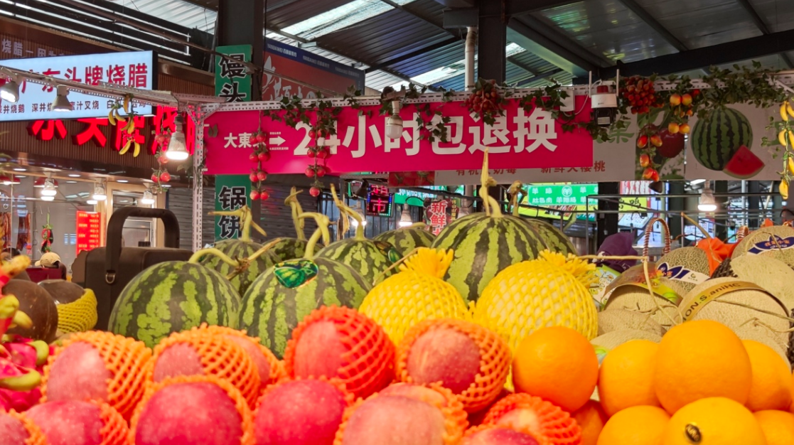 水果摊位后面挂着“24小时包退换”的提示牌