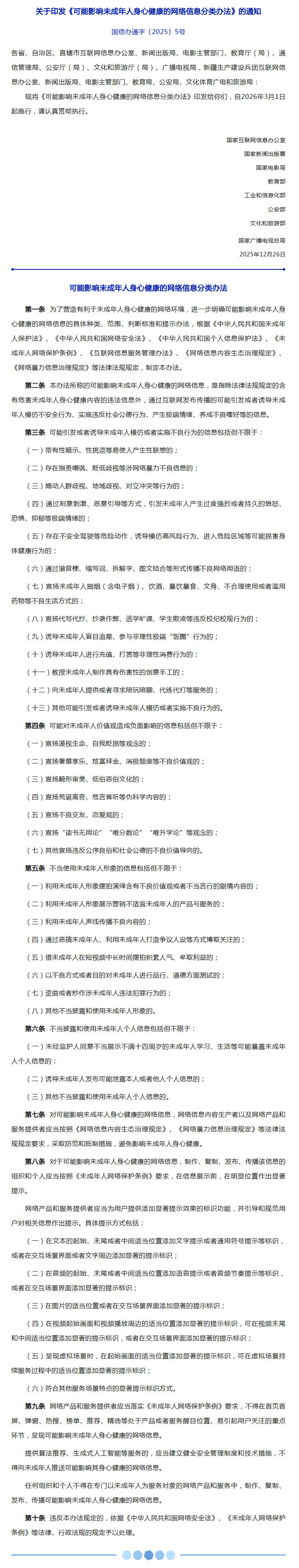 关于印发《可能影响未成年人身心健康的网络信息分类办法》的通知-九游会国际