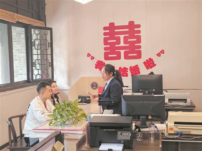5月10日,新修订的《婚姻登记条例》正式落地实施。我市各婚姻登记处积极开展“为爱加班”服务,为新人办理结婚登记手续。在周村区婚姻登记服务中心,来自黑龙江的崔先生和宁夏的杨女士成功领取结婚证,成为新条例实施后全省首对省外户籍仅凭身份证办理结婚登记的新人。
