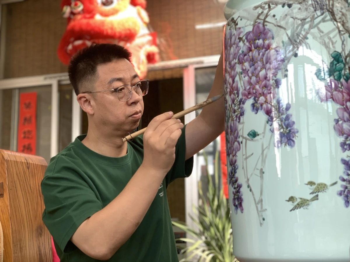 8月20日上午,在朱庄社区源创工作室,山东省工艺美术大师、陶瓷艺术大师张源源正在瓷瓶上进行艺术创作。“这幅作品叫紫气东来,以手指画同工笔相结合的形式,展现紫藤花紫气东来、花开富贵的艺术形象。”张源源向记者介绍,自2016年到朱庄社区设立工作室至今已有9年时间,“朱庄社区给我一种亲近感,从前期设立工作室到后期策划宣传,社区提供了多方面支持,让我可以在这里专心创作、安心发展。”