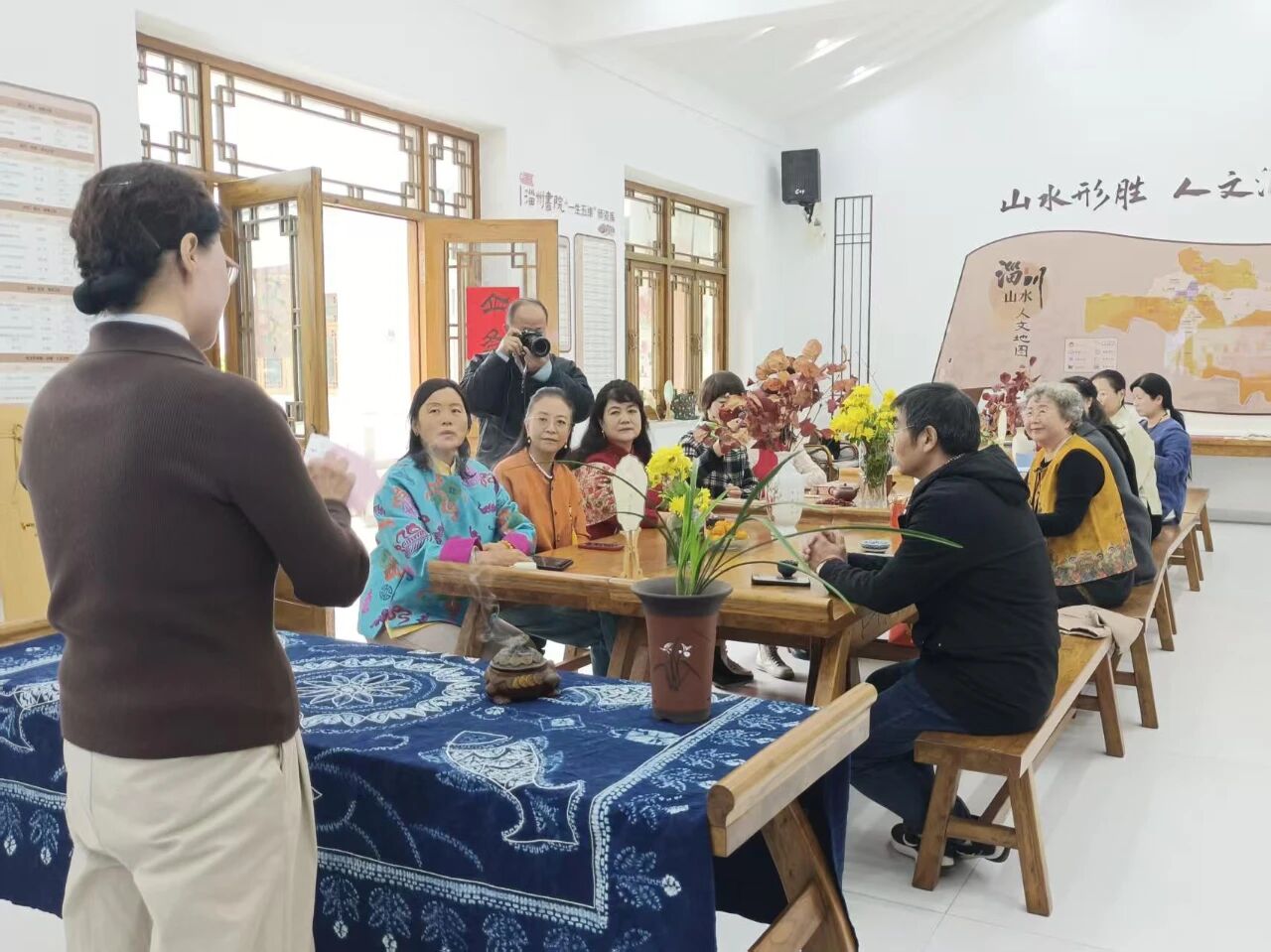 般阳是淄川的另一古称。“节令般阳”不只是一系列课程,更是一场贯穿四季的生活美学实践。今年以来,书院着力打造“节令般阳”四时风雅课程,以二十四节气为脉络,围绕“春生、夏长、秋收、冬藏”设计系列活动,依托由30余位专家学者、文艺骨干组成的师资库,已开展课程与雅集10余场,惠及居民300余人。在“聊斋话清廉”故事会上,讲师生动解读蒲松龄笔下的廉洁寓言;区诗词学会的老师们带领居民品读《诗经》韵味,解析节气诗词;“好柿成霜”主题活动中,书画学会老师指导创作绘扇,共话生命哲思。课程之外,书院更将时节之美与人文情怀延伸至书画展览。无论是“墨韵般阳·礼赞祖国”主题书画展中艺术家的现场创作,还是重阳节主题书画展上,居民们以翰墨丹青表达敬老之情、传承孝道文化,都成为课程成果的生动展示与升华。这些课程不是单向传授,而是将节气智慧融入社区生活,居民在微信群中持续分享课后创作。一幅字画、一把绘扇、一次家风讨论,让传统文化从课堂延伸至家庭,形成温暖流动的“节气生活圈”。