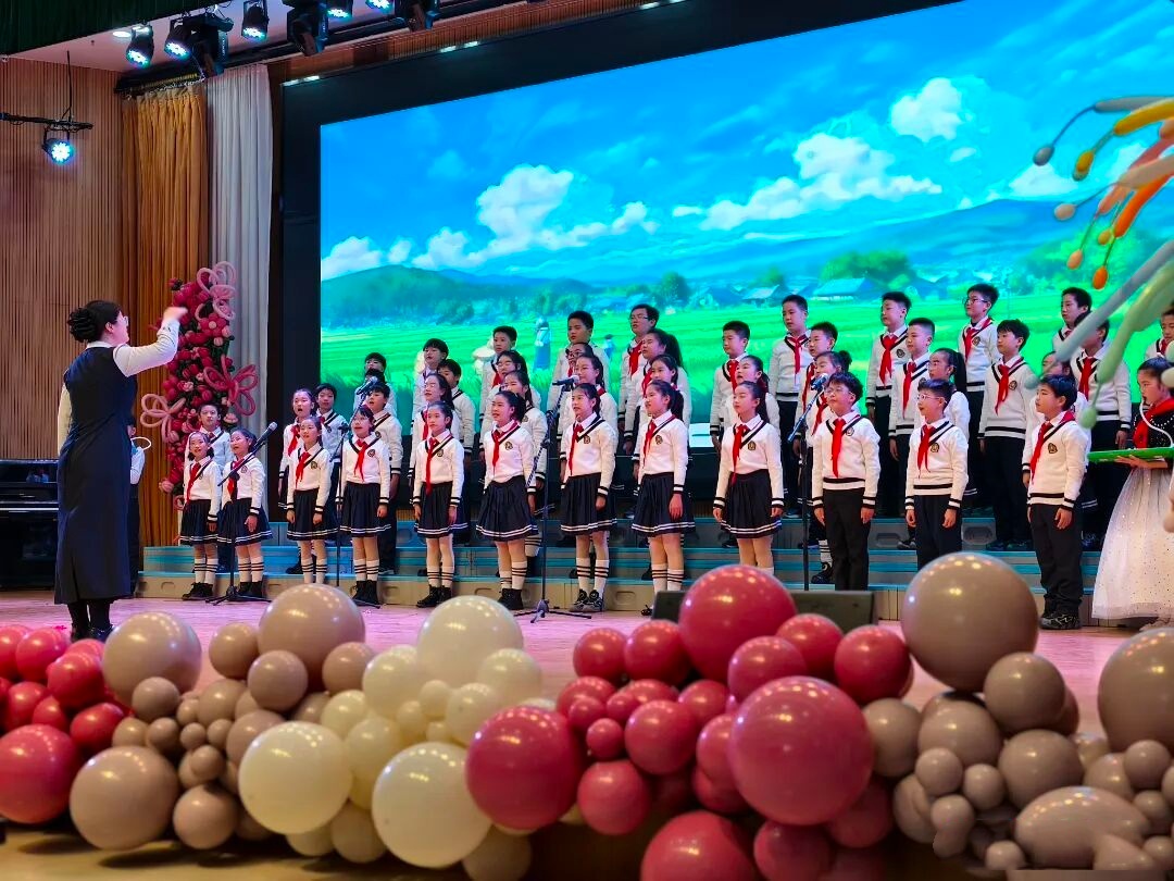 高年级同学的表演点燃了全场的热情。他们在发声技巧上精雕细琢,大胆尝试和声编排与分声部演唱等多元形式,简约大气的动作设计与贴合主题的道具运用,进一步提升了舞台表现力。一曲《歌唱祖国》慷慨激昂、铿锵有力,歌声中既有青春的蓬勃朝气,也饱含对祖国的深情与对未来的无限憧憬。