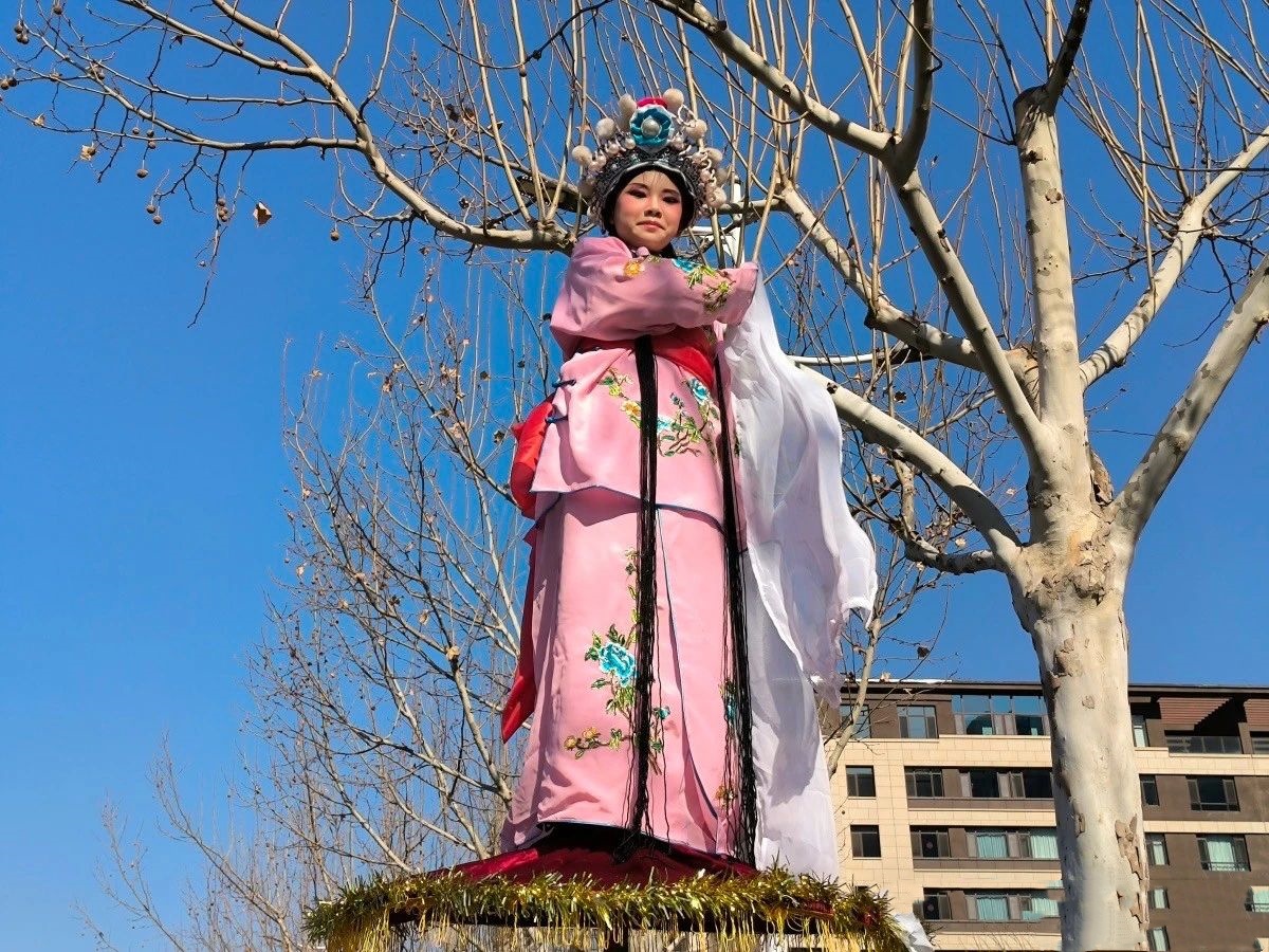 除了紧张刺激的高跷对决,现场的民俗表演同样精彩震撼。锣鼓铿锵,传承齐国尚武精神,展现新年朝气;穿着鲜艳服饰的秧歌队登场,彩绸飞舞,步伐灵动,充满欢乐祥和;芯子表演中,高空人物扮演角色,凌空飘然;身着宫廷服饰的模特一步一摇,尽显古韵风华,让人感受华夏衣冠之美……