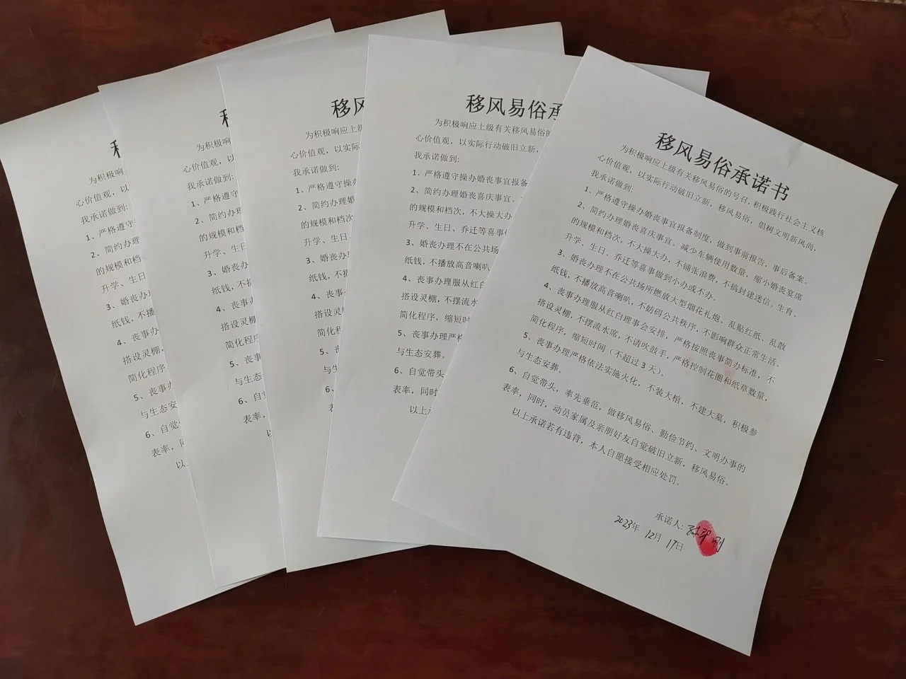 在移风易俗过程中,各村居党员充分发挥带头作用。一方面,与全镇2000余名党员签订《移风易俗承诺书》,实现全覆盖。党员带头承诺红白公事不大操大办,自觉杜绝天价彩礼、恶俗婚闹等行为,为全镇近40000名群众做了表率,树立了榜样。现在党员家中有红白公事的,都主动到村居红白理事会报备,由红白理事会工作人员帮助制定流程、估算费用等。对于党员违反移风易俗规定的,由各村居书记进行约谈。另一方面,连续5年在春节、清明节、中元节等时间节点,组织开展移风易俗文明实践活动,志愿者主动到村里的各个路口开展文明劝导,引导村民在集中焚烧点或者集中焚烧桶中焚烧纸钱等,既降低了森林火灾风险,又在全镇树起了文明祭祀的新风尚。