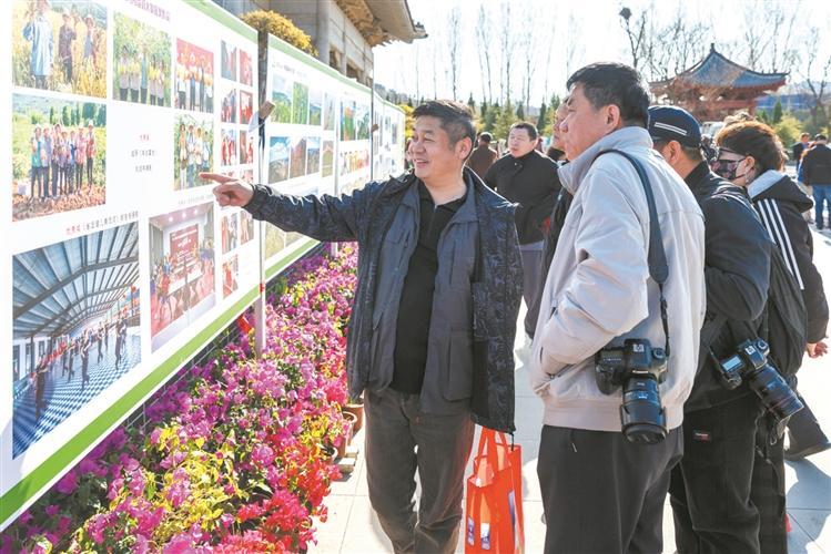 4月5日,淄川区西河镇马家庄村镶月湖森林公园,市民在观看“中国最美乡村公园”西河摄影大赛获奖作品展。