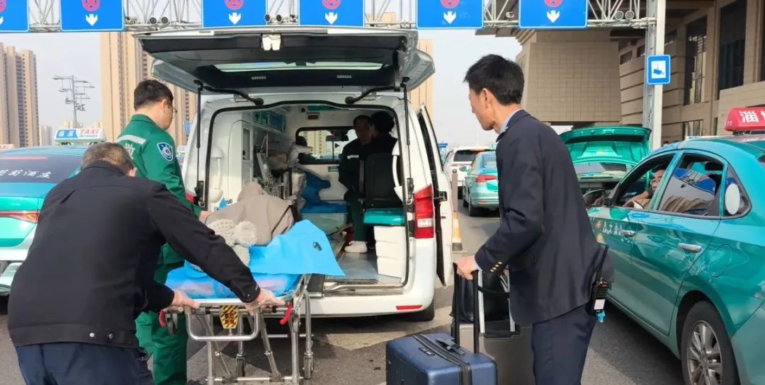 等待救护车期间,工作人员取来止痛药品和饮料,尝试缓解旅客的不适。120救护车抵达后,众人合力将旅客抬上担架,送往医院接受进一步治疗。据了解,目前该旅客已康复出院。