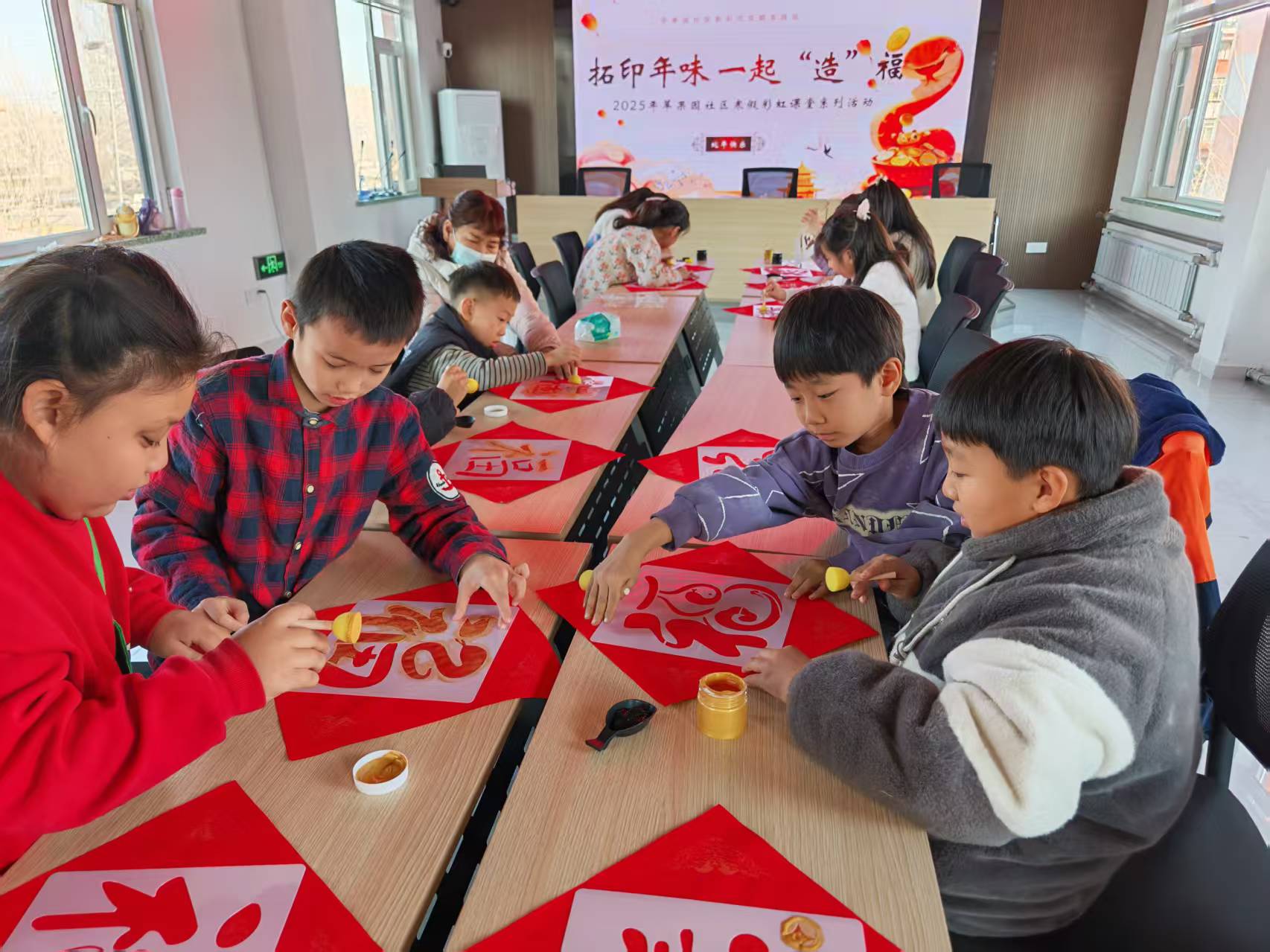 1月20日下午,苹果园社区寒假彩虹课堂开展“拓印年味 一起‘造’福”手工制作活动,一起迎接新春的到来。活动中,社区志愿者为大家准备了拓印工具,包括模板、红纸、金粉等,大家亲手挑选自己喜欢的模板,用金粉均匀地涂抹在红纸上,轻轻按压使图案清晰地印在纸上。此次活动不仅让孩子体验民俗乐趣,了解年俗文化,还让孩子们感受到了新春佳节的欢乐和喜悦。